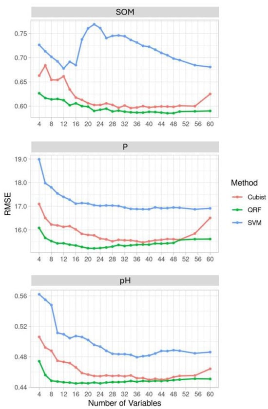 Figure 3. Model performance (as root mean square error, RMSE) for each soil property predicted according to the number of predictors selected by the recursive feature elimination procedure for three ML algorithms: Cubist, Quantile Regression Forest (QRF), and Support Vector Machine (SVM). SOM, soil organic matter; P, extractable phosphorus.