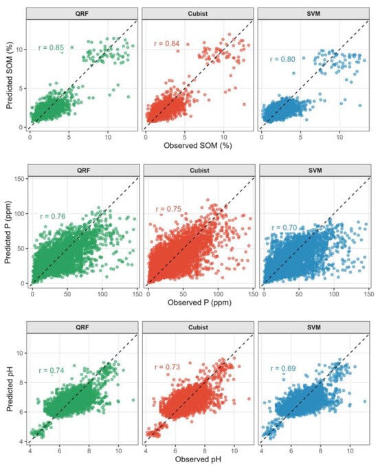 Figure 4. Scatter plots of observed versus predicted values for soil organic matter (SOM), extractable phosphorus (P), and pH using Quantile Regression Forest (QRF), Cubist, and Support Vector Machine (SVM). The 1:1 line is shown for reference.