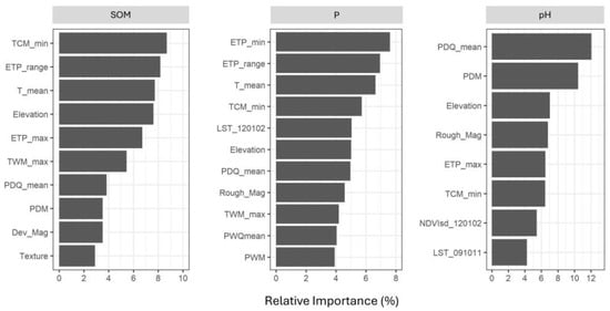 Figure 5. Relative importance of covariates for modeling soil organic matter (SOM), extractable phosphorus (P), and pH using a Quantile Regression Forest (QRF). The x-axis indicates the percentage of response variability explained by each covariate. The covariates shown collectively account for 60% of the total variability. Dev_Mag, maximum deviation from mean elevation; ETP_max, maximum monthly potential evapotranspiration; ETP_min, minimum monthly potential evapotranspiration; ETP_range, annual range of monthly potential evapotranspiration; LST_120102, mean land surface temperature from December to February; LST_091011, land surface temperature from September to November; NDVIsd_120102, standard deviation of normalized vegetation index from December to February; PDM, precipitation amount of the driest month; PDQ_mean, mean monthly precipitation amount of the driest quarter; PWQmean, mean monthly precipitation amount of the wettest quarter; PWM, precipitation amount of the wettest month; Rough_Mag, multiscale roughness variation; TCM_min, daily minimum air temperature of the coldest month; T_mean, mean annual air temperature; TWM_max, mean daily maximum air temperature of the warmest month.
