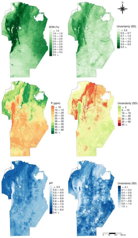 Beyond scientific insights, our findings also align with policy frameworks for sustainable soil management in Argentina. At the provincial level, Córdoba’s Good Agricultural Practices (BPA) program emphasizes soil testing, nutrient budgeting, and conservation practices. The observed declines in P and SOM highlight areas where these practices are most urgently needed, while uncertainty maps identify zones that require additional monitoring. These insights complement national soil conservation guidelines, particularly those focused on nutrient balance and the maintenance of SOM [75]. More broadly, they contribute to sustainability agendas by providing regionally specific evidence of soil fertility trends under land-use intensification.