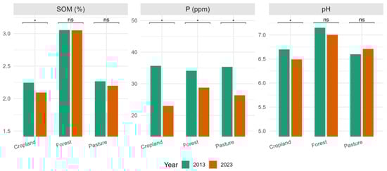 Figure 7. Temporal variation in soil organic matter (SOM), extractable phosphorus (P), and pH across different land-use categories (Cropland, Forest, and Pasture) in Córdoba province. Asterisks indicate significant differences between years (p < 0.05), while “ns” denotes non-significant differences.