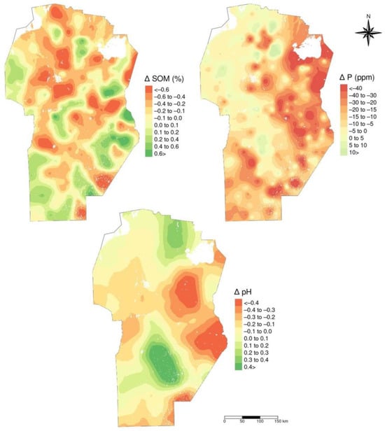 To assess changes in soil properties across land-use categories, we compared average values between 2013 and 2023 (Figure 7). In croplands, SOM declined from 2.24% to 2.09%, P from 35.6 to 23.0 ppm, and pH from 6.70 to 6.49; all three changes were statistically significant. In pastures, SOM decreased slightly from 2.27% to 2.20%, and pH increased from 6.60 to 6.71, but neither change was significant, whereas the decline in P from 35.3 to 26.3 ppm was significant. Forested areas exhibited stable SOM levels (3.05% in both years), a significant decline in P from 34.1 to 28.8 ppm, and a slight, non-significant decrease in pH from 7.15 to 7.00. These trends are further illustrated in the spatial distribution maps of changes in SOM, P, and pH across the province (Figure 8), which reveal heterogeneous spatial patterns, with more pronounced declines in SOM and P occurring in agricultural zones.