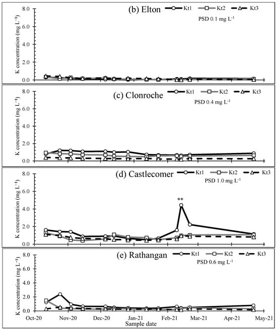 - Alfaro, M.A.; Gregory, P.J.; Jarvis, S.C. Dynamics of Potassium Leaching on a Hillslope Grassland Soil. J. Environ. Qual. 2004, 33, 192–200. [Google Scholar] [CrossRef]