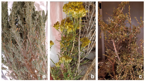Three fuels used for test burns: sagebrush (Artemisia tridentata) (SB) (a), rabbitbrush (Ericameria nauseosa) (RB) (b), bitterbrush (Purshia tridentata) (BB) (c).