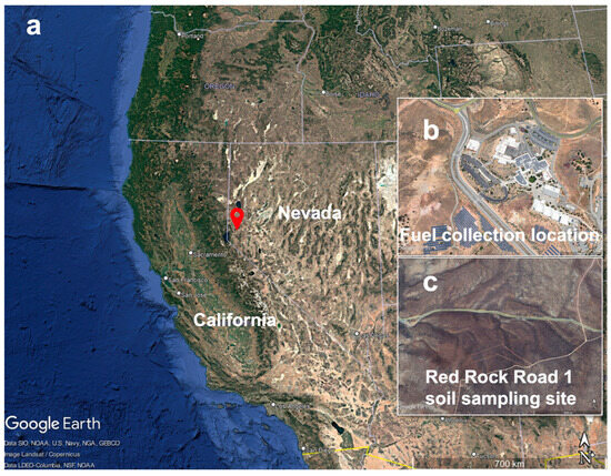Map showing: the location of the study site in Nevada (a), the fuel collection site (b), and the soil sampling site (c) (adapted from Google Earth).