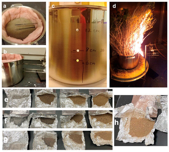 Laboratory setup of combustion experiments: Top view of the thermocouples inside the insulated pot (a), side view of the positions of the thermocouples (b), distances from the bottom of the pot where the thermocouples were placed in the ports (6, 8, 12 cm) (c), and laboratory burn of fuel (sagebrush) (d). Soil and ash samples collected after the laboratory burn (from left to right): RB ash, RB soil mixed with ash, RB burned soil, and RB burned soil from a 2 cm depth (e), SB ash, SB soil mixed with ash, SB burned soil, and SB burned soil from a 2 cm depth (f), BB ash, BB soil mixed with ash, BB burned soil, BB burned soil from a 2 cm depth (g), and unburned soil (h).