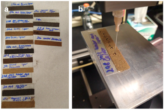 Apparent Contact Angle (ACA) measurements using the goniometer technique: soil mixed with ash samples prepared on microscope slides (a), and SB soil and ash sample prepared for the ACA measurements (b).