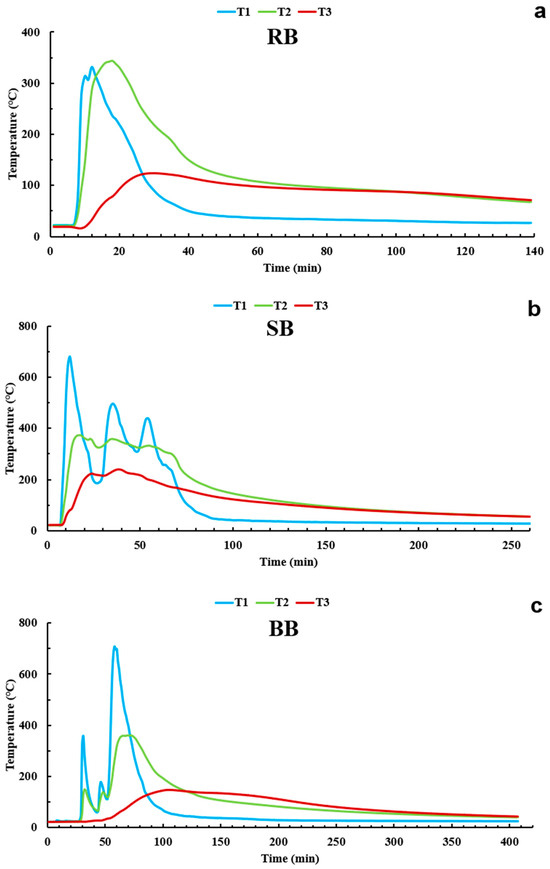 Air and soil temperatures as functions of time for all three tested fuel treatments: RB—rabbitbrush (a), SB—sagebrush (b), and BB—bitterbrush (c). Temperatures were taken during laboratory burn experiments using the following thermocouples: T1 is the thermocouple placed 4 cm above the soil surface, T2 is the thermocouple on the soil surface, T3 is the thermocouple 2 cm below the soil surface.