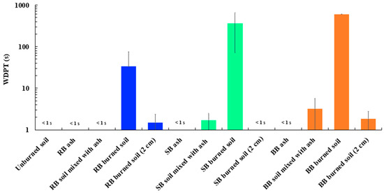 Figure 6 and Table S1 present the averaged WDPT values for all samples summarized in Table 1. Compared to the samples of unburned soil (WDPT < 0.5 s) and soil mixed with ash (WDPT: 1 to 3.2 s), burned surface soil samples and samples from the soil layer below the ash showed significantly higher WDPT values (~600 times) ranging from wettable to slightly–highly water repellent (WDPT: from 1 to 600 s) for all tested fuels (RB, SB, and BB). The WDPT measurements were stopped after 600 s due to visually detectable evaporation of deposited water droplets. It should be noted that the burned soils mixed with ash had lower SWR values compared to the burned soil samples, which is most likely due to the presence of highly wettable ash [30,33]. It is also interesting that the ashes from RB, SB, and BB were wettable, which is evident from their respective WDPT values being <1 s (Figure 6, Table 1). WDPT measurements of the soil samples collected at a 2 cm depth showed higher SWR for RB and BB compared to samples from SB. We hypothesize that fire-induced heat penetrated deeper into the soil for RB and BB fuels compared to SB fuel and caused high SWR [30]. DeBano et al. [36] discussed that the penetration of heat and hydrophobic compounds downward into the soil surrogate can cause the formation of SWR as deep as 3–4 cm for dry sand exposed to a 25 min burn. The differences in WDPT values depend on several parameters such as fuel type, soil structure and chemical composition, burn temperature and severity, amount of fuel, and fuel moisture content [22,23,27,32].