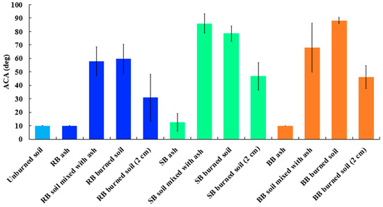 Figure 7 presents ACA values measured with the FTÅ1000 goniometer for all RB, SB, and BB fuel-treatment samples: ash, a mixture of soil and ash, burned and unburned soils, and burned soil from a 2 cm depth. The lowest ACA values were observed for the unburned soils and for the ash samples for all three fuel treatments; these values were all in the nonrepellent range of <10° to 12° [30,46]. The detection limit for ACA using the FTÅ1000 goniometer is approximately 10°, so the ACA values found for ash and unburned soil were at the detection limit of the goniometer. The highest values were found for the burned surface soils with ACAs 59.7° ± 10.9°, 78.4° ± 5.8°, 88.2° ± 2.4° for RB, SB, and BB fuels, respectively. Overall, the ACAs for burned soils for all three fuel treatments (RB, SB, and BB) were ~6 to 9 times higher than the ACAs of unburned soils. The samples of soil mixed with ash had slightly smaller ACA values (~3% smaller for RB and 23% smaller for BB) than the respective burned surface soil samples, whereas the burned soil ACAs for SB were comparable to the ACAs of soil mixed with ash. The slightly lower ACAs for soil mixed with ash were most likely due to the presence of wettable ash. Although the ACA and WDPT differences between burned soil samples and soil mixed with ash for RB were not statistically significant (ACA: RB: p = 0.7496 > 0.05, SB: p = 0.0404 < 0.05, BB: p = 0.0137 < 0.05—WDPT: RB: p = 0.065 > 0.05, SB: p = 0.0056 < 0.05, BB: p = 0.0001 < 0.05), we can still see differences in terms of ACA and WDPT for the same soil samples (burned soil and soil mixed with ash) for SB and BB. Soil samples from burned soil from a 2 cm depth had ACA values between 31° and 47° for all the fuels, which is in agreement with our WDPT results and indicates the formation of some SWR at a depth of ~2 cm, even though these ACA values were 40% to 48% lower than those for the burned soil samples.