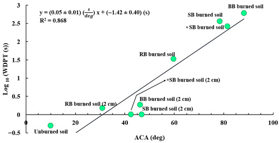 To compare the results from ACA measurements with the results from the WDPT test, the WDPT and ACA data points for the soil samples (unburned, burned, and 2 cm below the surface) were correlated. Figure 8 presents a summary of these results. A high correlation (R2 = 0.868) [87] between WDPT and ACA was found, indicating that WDPT and ACA are related. Shillito et al. [57] showed that there is a highly nonlinear relationship between WDPT and the effective contact angle of water-repellent sand. These findings are also in good agreement with other studies such as [3], in which the authors observed an increase in ACA values with increasing WDPT for the soil samples tested. The unburned soil showed no SWR, as expected. However, there was an increase in SWR in samples of burned soil and burned soil from a 2 cm depth, which is reflected in their WDPT and ACA values in the plot. Based on our results, we also conclude that ACA is likely more sensitive to SWR changes than WDPT. However, measuring ACA is also more labor and equipment intensive than a simple WDPT test. One reason that the WDPT test had a lower sensitivity than the ACA technique is that the WDPT measurements had to be stopped after 600 s due to water evaporation. Another study [88] also mentioned that the WDPT is only sensitive to a narrow range of ACA values (above 90°), so WDPT might not provide much information about SWR severity for the ACA values below 90°.