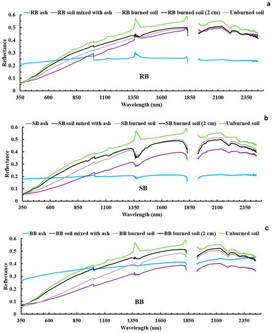 Reflectance spectra for all soil samples by fuel: RB—rabbitbrush (a), SB—sagebrush (b), BB—bitterbrush (c). For each spectrum, seven replicate measurements were taken with ASD FieldSpec 3 across leveled samples, and each measurement (point) is the average of ten collected reflectance spectra.