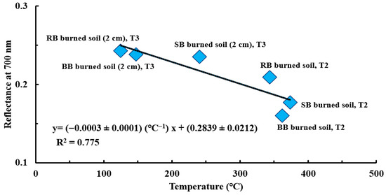 The reflectance spectra for all the samples of our previous study [4] look smooth in the visible range, with the highest variations around 700 nm. Therefore, a wavelength of 700 nm was selected to find a link between the reflectance of samples of burned soil and soil burned 2 cm below the surface (T2 and T3) and their respective temperatures during burns (temperature range: 124.4 °C to 373.5 °C). Figure 11 shows the relationship between these two variables, where the slope of −0.0003 ± 0.0001 °C−1 and R2 = 0.775 indicate a high negative correlation. As SWR increases (in terms of an increase in ACA), the reflectance decreases for a temperature range of 124.4 °C to 373.5 °C (T2 and T3, respectively). Therefore, the surface of the burned soil samples have lower reflectance than the samples of soil burned 2 cm below the surface, which is likely due to the higher fire-induced heating of the surface soil samples [36,74,77,78]. In other words, fire effects on the SOM make the soil color darker—as shown in the samples of burned soil and burned soil from a 2 cm depth using RB, SB, and BB fuel in Figure 3e–g—which means the reflectance is reduced. Studies such as [89,90,91,92,93,94,95,96,97,98,99,100] have investigated the effects of heat on the reflectance of burned soil and reported lower reflectance for burned areas. For example, Lugassi et al. [100] analyzed the spectral changes in the heated soil surface reflectance after a laboratory burn experiment to map the soil surface temperature. They reported lower reflectance for the heated soil under 250 °C as the temperature increased due to incorporation of soot (an overall reflectance of 0.41 for heated soil at 251 °C) and higher reflectance with increasing temperature in the burned soil above 250 °C because of a more complete combustion of SOM (an overall reflectance of 0.55 for heated soil at 432 °C) between 350 and 2500 nm. It should be noted that the soil structure and moisture content in the Lugassi et al. [100] study were different than those in our study, which may have affected the 250 °C threshold that led to changes in the correlation between reflectance and temperature of the soil heated at this temperature. Nevertheless, the correlation between the reflectance and temperature of soil heated under 250 °C reported by Lugassi et al. [100] is in agreement with our findings from temperatures collected at T3 and the reflectance at 700 nm (overall reflectance of 0.279 °C at 240.7 °C for burned soil from a depth of 2 cm using SB fuel).