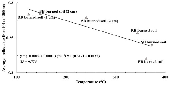The correlation between the averaged reflectance values and temperature for samples of burned soil and burned soil from a 2 cm depth for all fuels from 400 to 1300 nm (R2 = 0.776).