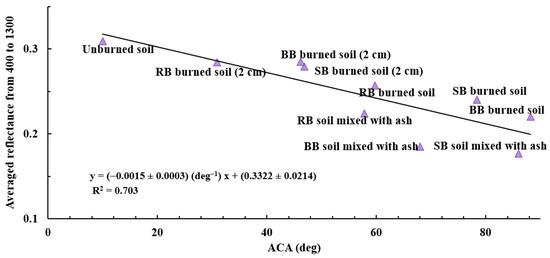 The correlation between the averaged reflectance values of samples of unburned soil, soil mixed with ash, burned soil, and burned soil from a 2 cm depth and their respective ACA (R2 = 0.703) for all fuels from 400 to 1300 nm.