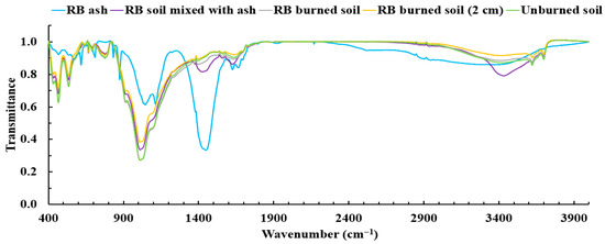 Analyzing SWR using ACA data and reflectance, showed a high negative correlation (R2 value of 0.703) between the averaged reflectance values (400 to 1300 nm) and the ACAs of samples of unburned soil, soil mixed with ash, burned soil, and burned soil from a 2 cm depth for all analyzed fuels (Figure 13). The samples of soil mixed with ash had lower reflectance (~1.14 to ~1.57 times) than samples of burned soil and burned soil from a 2 cm depth. This was most likely due to the presence of dark ash in the samples of soil mixed with ash, which was also observed visually (Figure 3e–g). The highest averaged reflectance between 400 nm and 1300 nm was for the unburned soil samples (Figure 13), which was also observed for reflectance at 700 nm (Figure 12) and visually (Figure 3e–g). In addition, samples of soil mixed with ash had the lowest averaged reflectance values for all samples except for RB soil mixed with ash, which had a slightly higher reflectance (~2%) than BB burned soil over the same spectral range (Table 3). Overall, the reflectance of samples of burned soil and burned soil from a 2 cm depth using RB, SB, and BB fuel are consistent for the averaged reflectance (between 400 nm and 1300 nm) and for 700 nm data (Figure 11, Figure 12 and Figure 13). The reflectance is reduced in soil samples with darker ash due to the heat of fire and modified soil chemistry. To assess the differences in the chemical nature of unburned and burned soils that cause SWR and changes in reflectance properties, we analyzed the chemical functional groups using the FTIR technique.