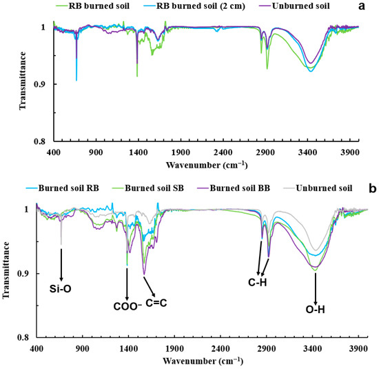 Figure 15a shows the spectra of extracts for samples of unburned soil, burned soil, and burned soil from a 2 cm depth using RB fuel and the spectra for SB and BB fuels are included in the supplementary material (Figure S2). Figure 15b shows the differences between the unburned and burned soil samples for RB, SB, and BB and identifies six major peaks. To compare these spectra, six distinguished peaks were identified, highlighted, and assigned (Table 4, Figure 15b). The peaks at ~3620 and ~3699 cm−1 are related to the O–H stretching of inorganic clay content [69,105]. The broad peak at ~3400 cm−1 is due to the O–H stretching of hydroxyl groups of phenol, water, and alcohol [69,89,106]. The double peaks between the spectral bands of ~2850 and ~2922 cm−1 correspond to the symmetric and asymmetric stretching of aliphatic C–H bonds [69,105,107,108]. The absorption band at ~1384 cm−1 is related to O–H deformation, carbonates, stretching of aliphatic C–H cm−1, phenolic groups, and asymmetric stretching of COO− (carboxylate) and C=O (carbonyl) groups [70,109,110,111,112]. The peak at ~1437 originates from the asymmetric stretching vibrations of C=O and the presence of carbonate [4,106,112,113]. The presence of one band at ~469 cm−1 is characteristic of O–Si–O bending vibrations in silica glass and quartz [113]. The sharp peak at ~1011 cm−1 represents polysaccharides and Si–O and C–O–C stretching in clay minerals and quartz in the soil [69,89,106]. Additionally, the peak in between 1600 and 1740 cm−1 and the asymmetric peaks at ~1740 to 1700 cm−1 and at ~1640 to 1600 cm−1 have been associated with aromatic C=C, C=O bands of amide and carboxylic acid or ketone [69,89,109,110,112,114,115]. The peak at 1560 cm−1 is indicative of C=C bonds of aromatic rings and O–H bending vibrations in imogolite and allophane [116,117]. It should be noted that the position of peaks corresponding to the organics might be slightly shifted. For example, the peak corresponding to C=C aromatics is at 1560 cm−1, as reported by [116], whereas in this study it is detected at around 1569 cm−1. This could happen for several reasons, such as differences in soil composition (e.g., particle size) and overlapping of the FTIR signal from different functional groups [89,106,117,118,119,120,121,122]. Several studies [89,122,123,124,125] observed similar functional groups to those detected in this work and around the similar frequency region in the FTIR spectra of postfire soil. For example, Diniz et al. [124] presented the vibrations of C=C (aromatic) around 1600–1400 cm−1, C–H groups around 2979–2850 cm−1, C–O stretching between 1033 cm−1 and 1099 cm−1, and O–H stretching at 3300–3270 cm−1 in the FTIR spectra of heated SOM after prescribed fire. Rossi et al. [125] detected absorption bands at 2925 cm−1 and 2855 cm−1 for aliphatic methyl, C=C aromatic rings in the 1720 to 1600 cm−1 range, and O–H groups between 3440 cm−1 and 3380 cm−1 in the transmission FTIR spectra of soil after pre-harvest straw burning.