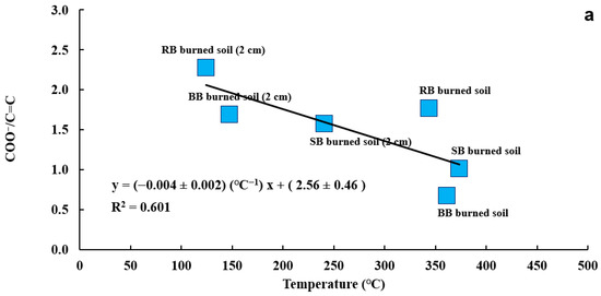 To investigate how chemical composition is affected by burn temperature and how this is reflected in soil hydrophobicity, the results of FTIR chemical functional group analysis were compared with soil temperature and ACA measurements. Figure 16a shows the correlation between the COO−/C=C and temperature for samples of burned soil and burned soil from a 2 cm depth and the combustion of RB, SB, and BB fuels. A moderate negative correlation (R2 = 0.601) between temperature increase (from 124.4 °C to 373.5 °C) and a decrease in COO−/C=C ratio by 55.7% was determined. Similar to COO−/C=C and temperature trends, the COO−/C=C ratio and ACA showed a high negative correlation (R2 = 0.900; Figure 16b). These correlations clearly indicate that decarboxylation (removal of COO−) and the formation of C=C functional groups (or aromatic compounds) during burns in the temperature range of 124.4 °C to 373.5 °C are responsible for the formation of SWR, as indicated by an increase in ACA from 31° for unburned soil to 88° for burned soil. Samburova et al. [3] also observed an increase in aromaticity in their burned soil samples from wildfires. Their findings confirmed that aromatic compounds including PAHs most likely contribute to fire-induced SWR. As was mentioned above, several other studies [122,124,133,135] show similar results (aromatization and decarboxylation in burned soil). However, some studies concluded [26,43,89,92,128,143,144] that compounds with aliphatic nature have the biggest effect on SWR. For example, Simkovic et al. [89] and Wu et al. [128] concluded that SWR was strongly correlated to the presence of aliphatic structures such as fatty acids and the degradation of those structures resulted in the soil samples becoming hydrophilic again. To explain these discrepancies related to the nature of fire-induced SWR, more comprehensive quantitative and qualitative chemical analyses on different postfire soils are needed.