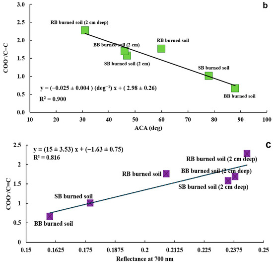 Figure 16c presents the correlation between the COO−/C=C ratio and the reflectance of the samples of burned soil and burned soil from a 2 cm depth at 700 nm wavelength. This high correlation (R2 = 0.816) shows that as the COO−/C=C ratio decreases, the reflectance of the samples decreases. In other words, when the samples become less polar (more hydrophobic), their reflectance decreases. Even with our limited number of samples, our results show that reflectance measurements (e.g., measurements with remote sensing tools [4,145,146,147,148]) of postfire soils can potentially be used not only for detecting SWR (Section 3.3 Reflectance analysis of samples, Figure 13), but also assessing the chemistry of the soil surface that causes fire-induced SWR. To the best of our knowledge, this is the first study that shows a relationship between soil chemistry and reflectance.