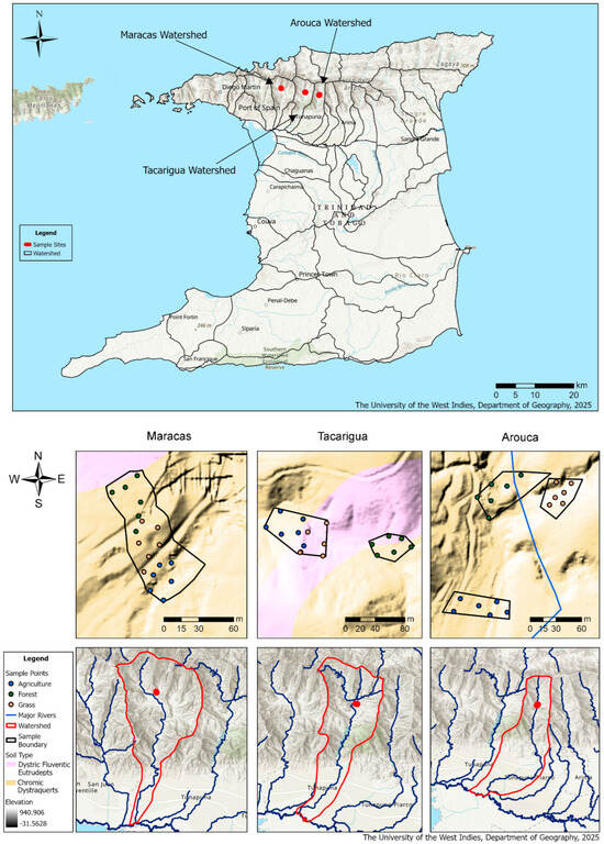 Three sub-watersheds in the Northern Range of Trinidad were selected to represent a gradient of anthropogenic management intensity: Arouca (10°41′54.7″ N 61°19′20.7″ W), considered the most pristine with minimal intervention; Maracas (10°42′49.6″ N 61°24′44.5″ W), with intermediate management intensity; and Tacarigua (10°42′02.5″ N 61°21′00.5″ W), the most intensively farmed sub-watershed, featuring high-input vegetable production (Figure 1). Based on the USDA Keys to Soil Taxonomy, the dominant soil types within the study area are Chromic Dystraquerts and Dystric Fluventic Eutrudepts [31] (Figure 1). The three sub-watersheds vary in their level of farming intensity, with Arouca being the most pristine and Tacarigua the most intensively farmed. Each sub-watershed included three adjacent land use areas (forest, grass, agriculture), hereafter referred to as plots; thus, land uses are nested in sub-watersheds. Forest plots were characterized as seasonal evergreen forests. Perennial grass plots were dominated by a mixture of Elephant grass (Pennisetum purpureum) and fowl-foot grass (Eleusine indica). Agricultural plots varied from long-term plantation crops such as cocoa (Theobroma cacao L.), medium-term green fig (Musa acuminata), short-term pigeon peas (Cajanus cajan), and habanero peppers (Capsicum chinense habanero) (Table S1). Soil depth information is unavailable for most of the study areas. However, De Caries et al. [32] measured soil depth (i.e., the depth to the argillic horizon), which ranged from 0.17 m to 1.25 m along a transect in the same study site in the Maracas sub-watershed. Based on soil sampling exercises, soil depth was generally deepest in the Maracas sub-watershed, followed by the Tacarigua and then the Arouca sub-watersheds.