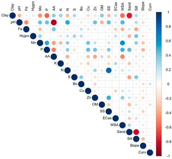 Correlation matrix between landscape factors and soil properties across the three sub-watersheds. Clay = Clay content, Fe = iron, Hygro = hygroscopic water content, Mn = manganese, P = phosphorus, AA = acid activity, K = potassium, N = nitrogen, S = sulphur, Bo = boron, Cu = copper, Zn = zinc, OM = soil organic matter content, SS = soluble salts, ECas = apparent soil electrical conductivity (0–0.5 m), WSA = water-stable aggregates, Sand = sand content, Silt = silt content, Curv = curvature.