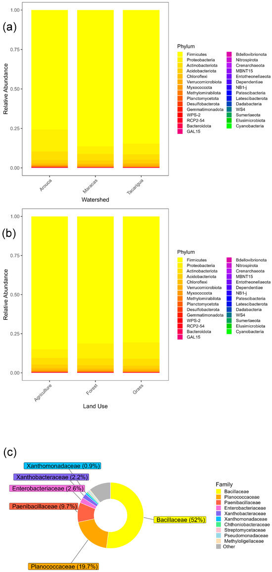 The study used 54 samples collected from the three sub-watersheds and the three land uses. After removing chloroplasts, mitochondria, and unclassified phyla, 1,228,727 ASVs were retained, averaging 22,754 reads per sample with a range of 14,123 to 32,662. A total of 5356 unique ASVs were identified. At the phylum level, Firmicutes were overwhelmingly dominant, comprising 85% of ASVs across all sub-watersheds and land uses (Figure 3a,b), followed by Proteobacteria and Actinobacteriota. We note that this high relative abundance may be influenced by the use of LifeGuard DNA preservation solution, which can enhance the recovery of endospore-forming Firmicutes [64]. Despite this potential bias, clear patterns emerged: Firmicutes were least abundant in the most pristine Arouca sub-watershed and under forest and grassland land uses, which are least affected by anthropogenic activities.