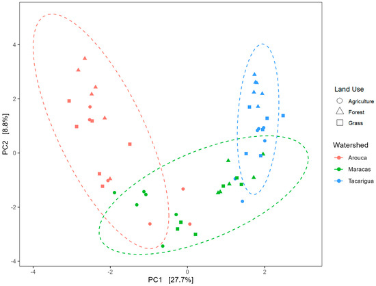 In contrast to the clear effect of sub-watershed on the bacterial α-diversity, we observed no significant differences in α-diversity indices among land uses (Table 3). However, an analysis of β-diversity revealed strong and interpretable patterns consistent with the SFT approach. Sub-watershed and land use both significantly impacted bacterial community structure (Figure 6 and Table 5). Bacterial communities were distinctly clustered by sub-watershed, explaining 28% of the variation, while land use explained an additional 20%. Along PC1, the Arouca (most pristine) and Tacarigua (most intensively farmed) sub-watersheds were well separated, with Maracas in an intermediate position. The observed pattern also mirrors the hypothesized temporal trajectory of land-use intensification (forest → grassland → agriculture) across watersheds of increasing land management pressure.