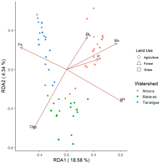 Redundancy Analysis (RDA) biplot of soil bacterial communities across sub-watersheds and land uses constrained by significantly correlated soil parameters; Fe = iron, Clay = clay content, θh = hygroscopic water content, Mn = manganese, P = phosphorus, pH = soil pH.