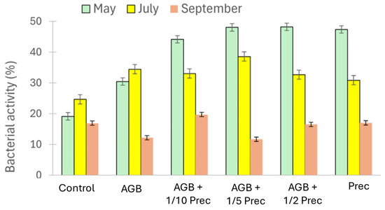 Microbial activity, as measured by flax cloth decomposition, increased by 54–58% in AGB+1/5Prec and AGB+1/2Prec treatments. Aggregate stability in the 0–20 cm soil rose from 29% (control) to 46–51% in the AGB+1/5Prec, AGB+1/2Prec, and Prec treatments. Spring barley yield increased from 0.87 t ha−1 in the control to 1.11–1.32 t ha−1 in treated plots, with the highest yield observed in AGB+1/2Prec (a 51.7% increase).