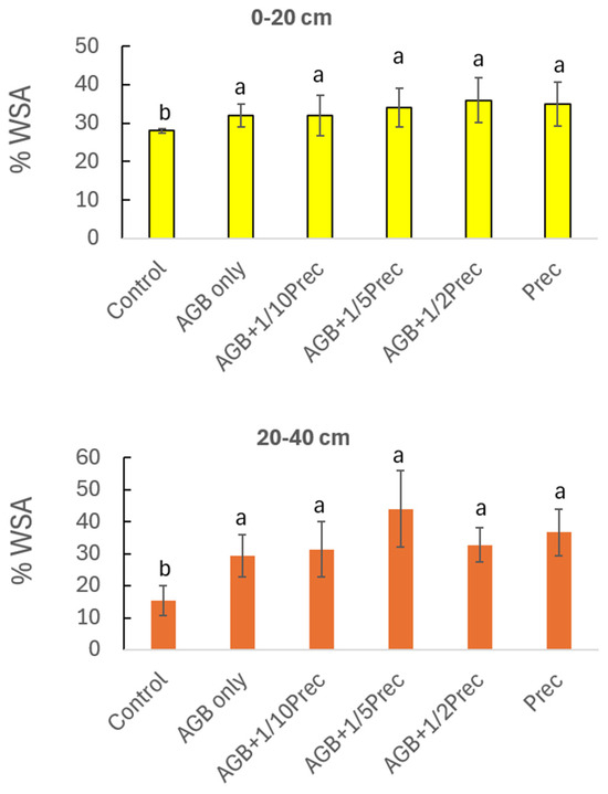 % water stable aggregates in soil layers 0–20 cm and 20–40 cm. LSD05 (0–20 cm) = 9.9, LSD05 (20–40 cm) =14.2. At both depths, all amended treatments exceed the control (letters: control = b, all amendments = a; α = 0.05). Differences among amended treatments are not statistically separable (shared a), though AGB+1/2 Prec shows the highest mean at each depth. Subsoil %WSA is lower than at the surface, yet amendments still yield significant gains over the control.