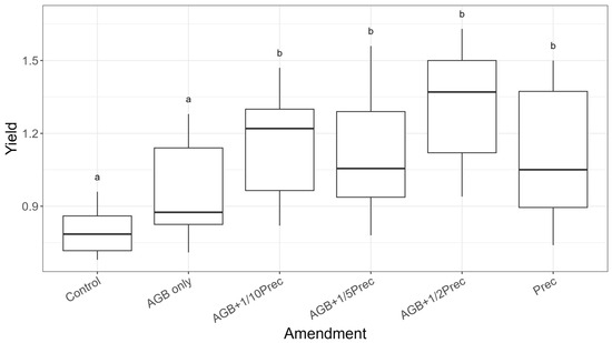Barley grain yield (t ha−1) across all years by amendment treatment. Boxplots show median (line), interquartile range (box), and 1.5 × IQR whiskers. Letters denote groups from Dunn’s post-hoc test at α = 0.05; treatments sharing a letter do not differ. Single-year results are provided in Appendix A.2 (Figure A1).