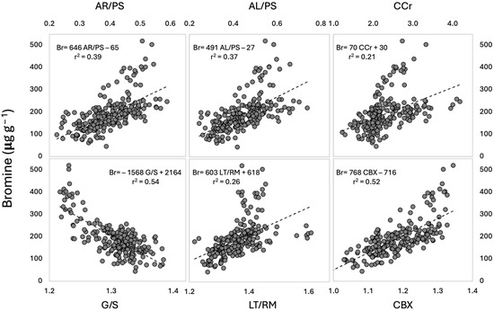 Bromine concentrations in the peat were significantly (p < 0.01) correlated to the MIR indices (Table 1), with CBX and G/S showing the highest correlation coefficients. AR/PS, AL/PS, and LT/RM were moderately correlated, and CCr was marginally correlated. It is evident from the scatterplots (Figure 3) that the data population contained two groups, with samples having Br concentrations above ~250 μg g−1 departing from the trendline of the other samples. This departure was less apparent for the G/S and the CBX indices. These samples belong to the cores located to the east of the bog (Figure 1).