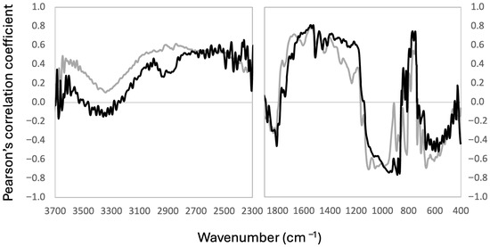 Figure 4. Correlation spectra for Br concentrations. Each value corresponds to the Pearson coefficient of the correlation between the normalized absorbance of each wavenumber and Br concentration in the peat samples. The gray line is the correlation for samples of the western cores (low overall Br concentrations, n = 97) and the black line is the correlation for samples of the eastern cores (high overall Br concentrations, n = 95).