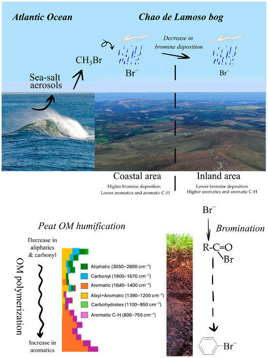 In the Chao de Lamoso bog, maximum Br concentrations in the peat were similar to those obtained in previous peat studies in oceanic areas. Our results also suggest that only a small proportion of the deposited bromide is retained as OM-Br compounds, coupled to peat decomposition (i.e., OM oxidation), and to the presence of carboxylic and lignin moieties, in particular.