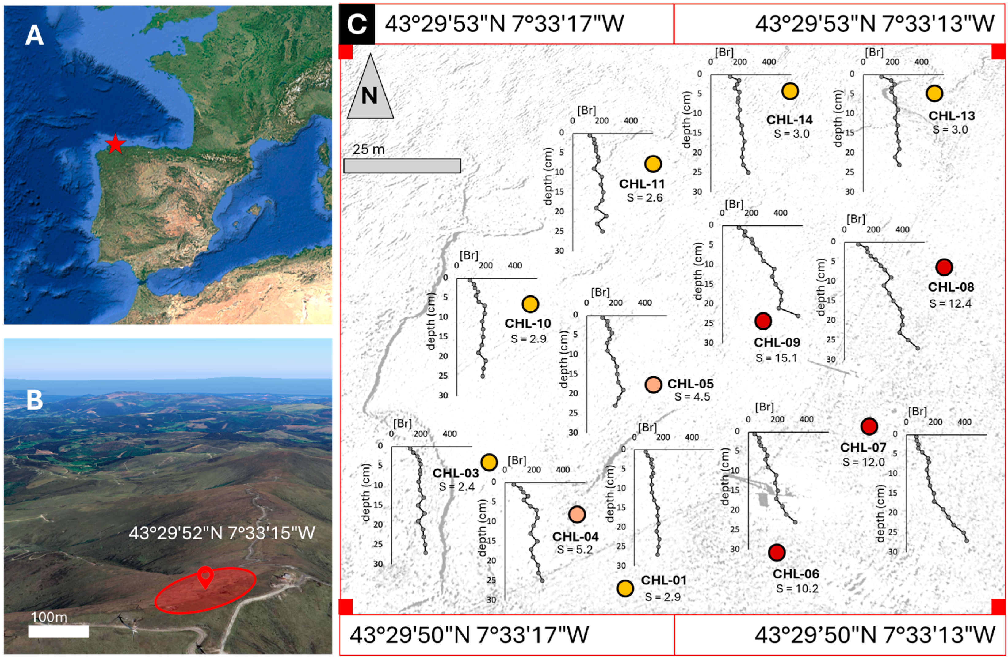 Figure 1. (A) Location of the Chao de Lamoso bog (red star). (B) Location of the studied area (c. 1 ha) in the bog. (C) Br concentrations (μg g−1) in the CHL short cores. S: slope of the depth/concentration relationship. A strong pattern of increasing slope from the west to the east is apparent (color, from yellow to red, of the circles). The background gray image corresponds to the actual bog area where the cores were collected (images taken from Google Earth; image from year 2024).