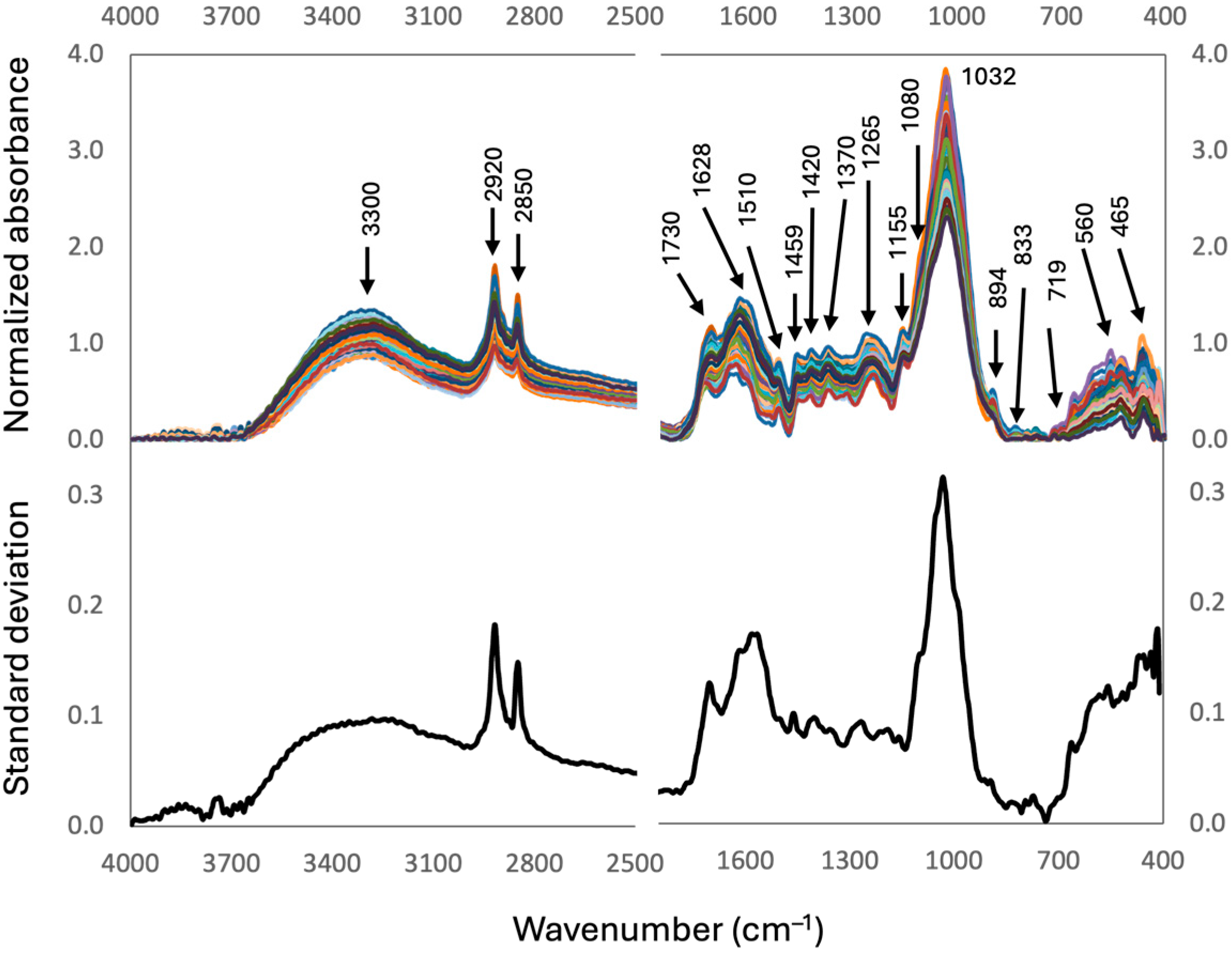 Figure 2. Upper panel, MIR Spectra of the peat samples of the CHL cores analyzed in this study (n = 192), with an indication of the wavenumbers of the main absorbances. Assignation of the absorbances can be found in Table A2. Lower panel, standard deviation spectrum showing the regions which show the largest variability between samples. Colors are intended to enhance spectra visualization.