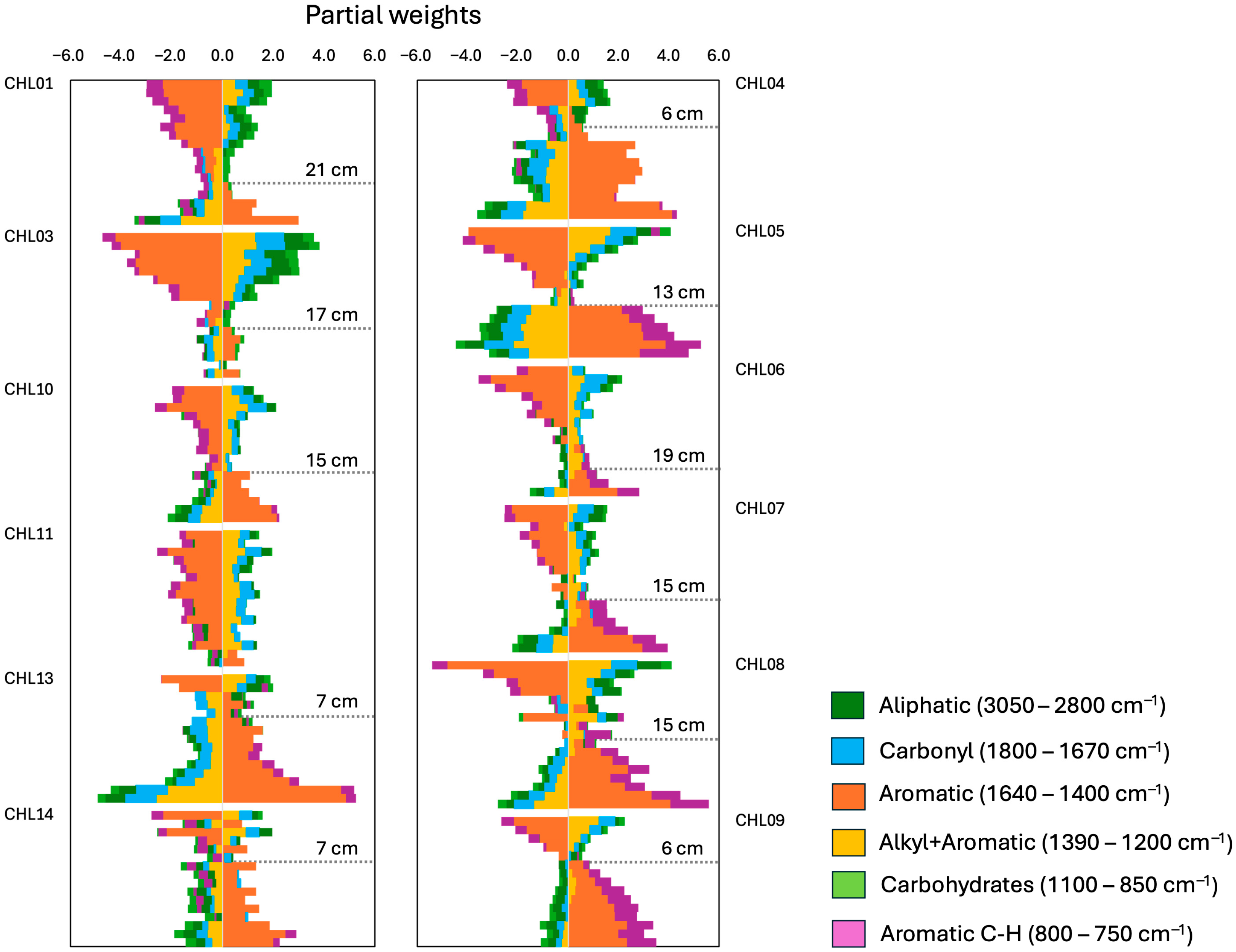 The MIR spectra of the samples from the studied CHL cores are characterized by the occurrence of various functional groups that are associated with the peat organic components, including polysaccharides, lipids, proteins, lignin and other aromatics, and organic acids, among others [36,37,38]. On the one hand, these components are primarily related to the plant material constituting the peatland vegetation; on the other hand, they are also connected to peat OM transformations related to the influence of environmental factors (i.e., climate, seasonality, and hydrological conditions) and time. For example, the large variability shown by the 1100–960 cm−1 spectral region, related to polysaccharides content, is mainly due to differences between the upper and bottom peat layers of the cores, i.e., a substantial decrease of polysaccharide compounds with increasing depth/age. This pattern reflects the long-term peat decomposition process through which labile peat OM compounds are depleted [21,37,39]. The high variability shown by the aliphatic groups can be associated with the formation of humic substances taking place during the peat OM degradation [40,41]. Also, the moderate variability observed in the 1500–1100 cm−1 region suggests differences in the occurrence of lignin and specific organic acids, compounds that are less susceptible to the overall transformation processes. This is consistent with previous studies indicating the resistance to degradation of aromatic compounds, because their complex structure makes it difficult for enzymes to recognize and break them down efficiently, unlike the more regular and linear structures of polysaccharides [31,42].