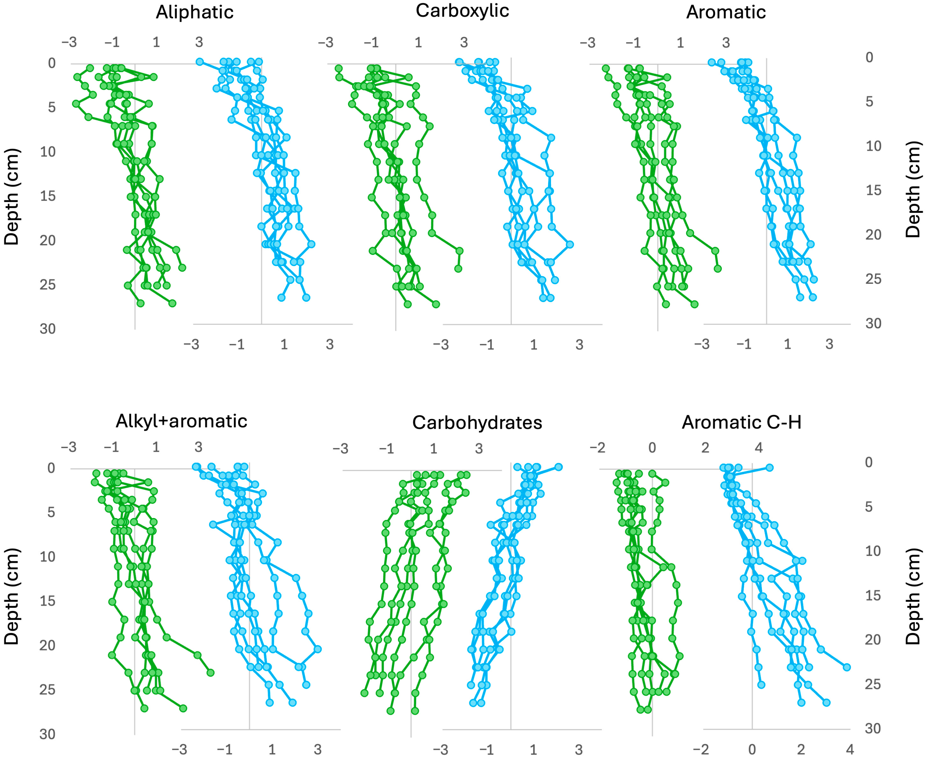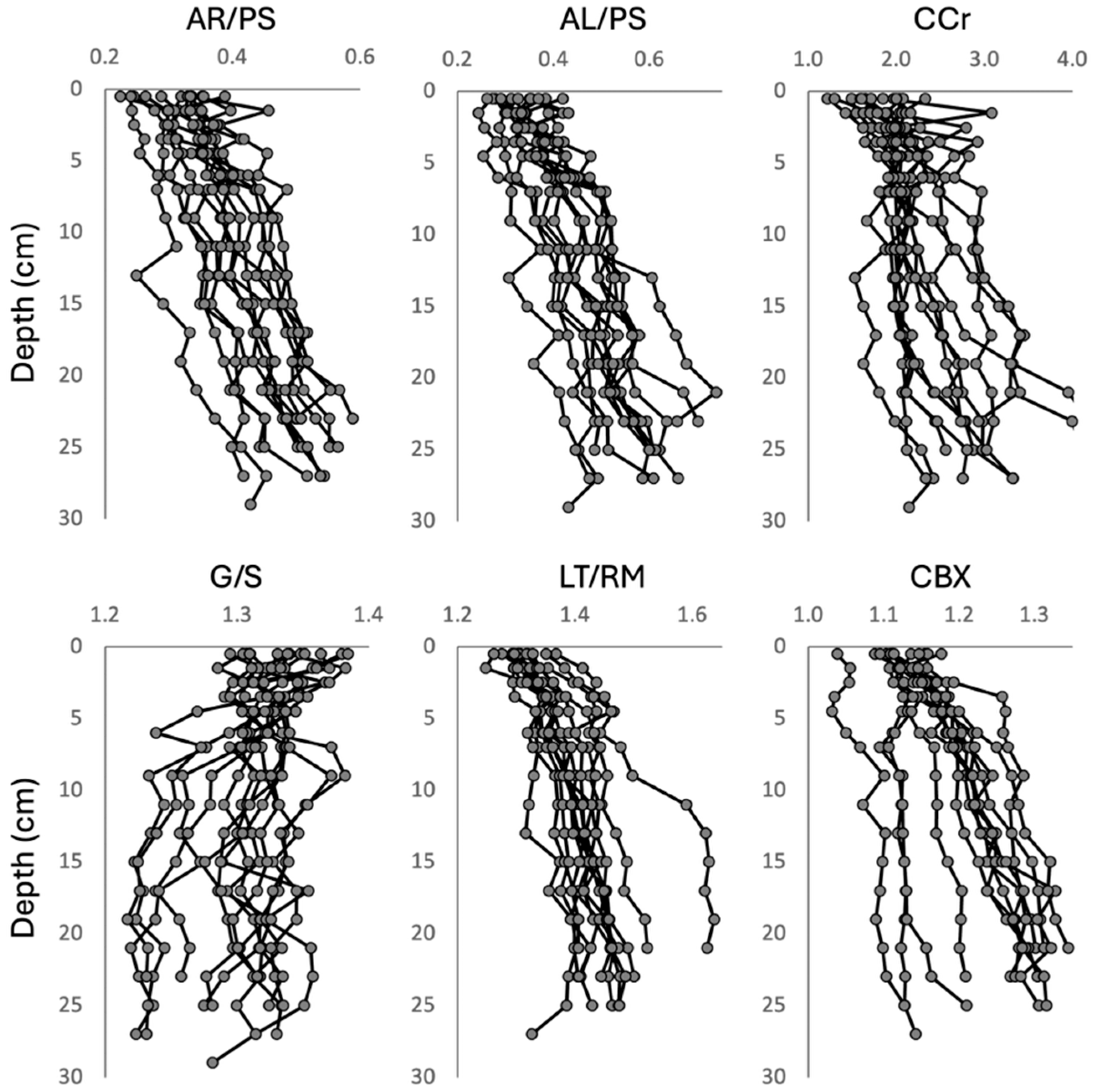 The depth records of the MIR indices can be found in Figure A1. Almost all indices showed an increase in values with depth, with an exception made for the guaiacyl/syringyl (G/S) index, which showed a tendency to decrease with depth. Collectively, they all showed substantial spatial variability that increased with the peat depth. The aromatics/polysaccharides (AR/PS), aliphatics/polysaccharides (AL/PS), and carboxylic (CBX) indices were highly correlated between them (Table 1), and the length/ramification of the aliphatic chains (LT/RM) were moderately correlated to these indices. The correlation of G/S to the other indices was marginal.