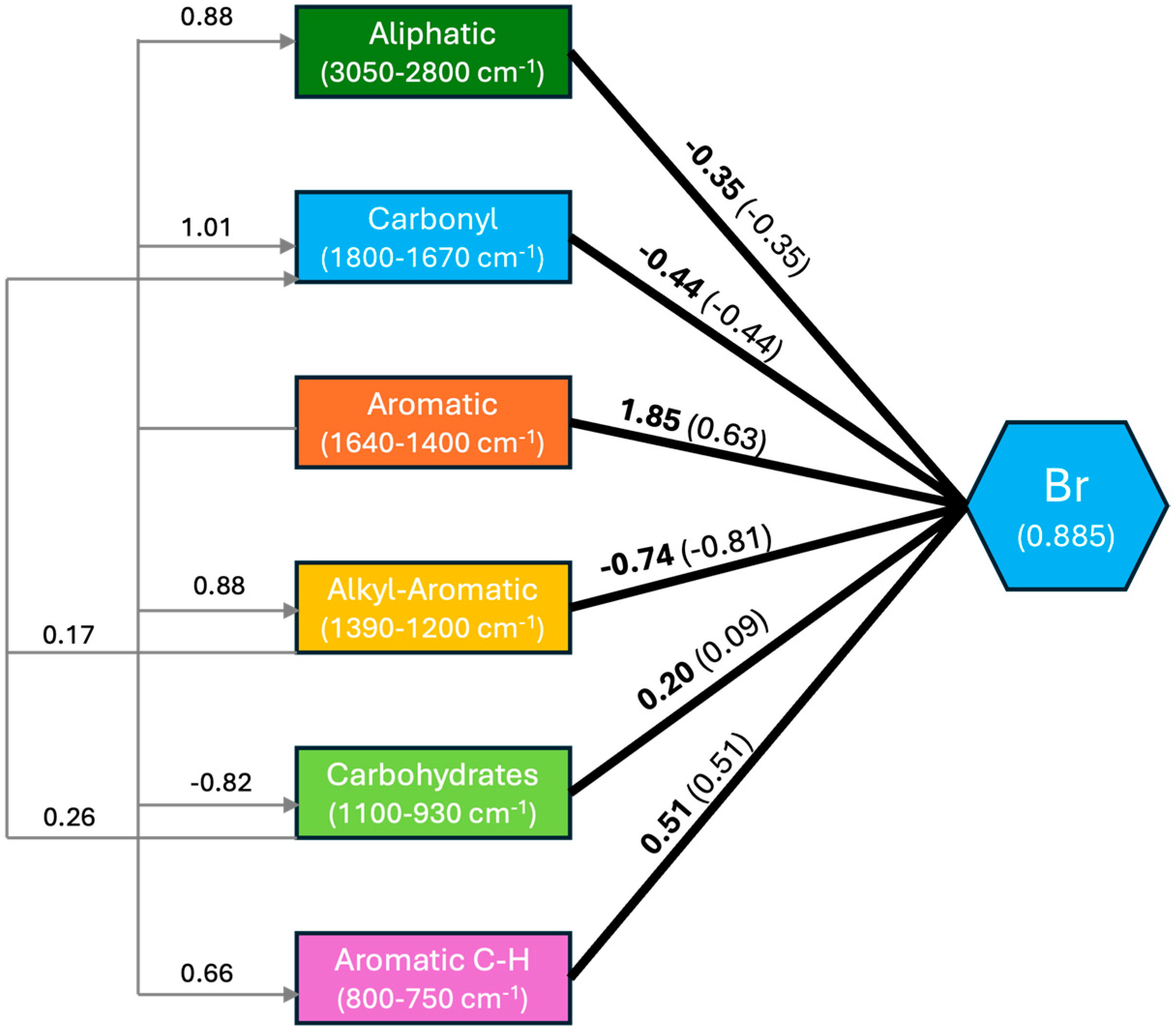 The MIR regions showed significant interactions between them (Figure A2). Large positive interactions were found between the aromatics and aliphatics, aromatic C-H, carbonyl, and alkyl+aromatics. Aromatics showed a large negative interaction with carbohydrates. Low to marginal, positive interactions were observed for alkyl+aromatics and carbohydrates with carbonyl. The largest total positive effects corresponded to the aromatics and aromatic C-H (Figure A2). The largest negative total effect corresponded to the alkyl+aromatics, showing the aliphatic and the carbonyl moderate, negative total effects on the Br concentration. The total effect of carbohydrates was close to zero.
