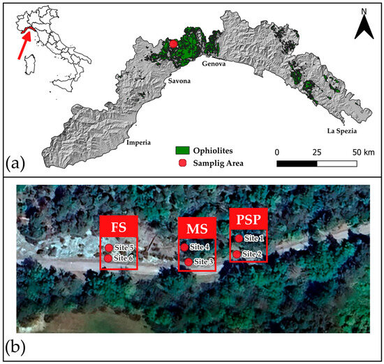 (a) Location of the study area within the Voltri Massif, Liguria, Italy (region marked in red). The green area indicates the ophiolite formations (serpentinite soils); the red dot marks the specific sampling area (Source: Liguria Region Open Data) [43]. (b) Detailed view of the sampling area. The satellite image shows the sites according to their distinct bedrock (listed from right to left on the map): partially serpentinized peridotites (PSP: Site 1 and Site 2), massive serpentinites (MS: Site 3 and Site 4), and foliated serpentinite (FS: Site 5 and Site 6) [39].