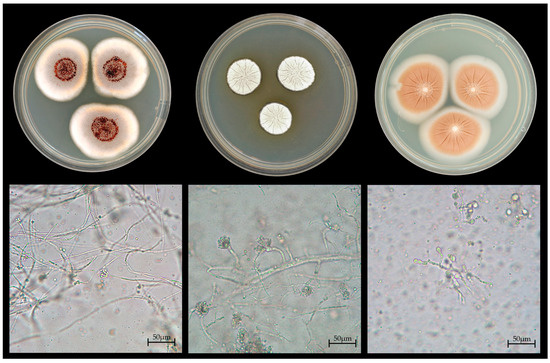 Colonial and micromorphological features of key fungal isolates. (Top) row: colonies grown on MEA + C (from (left) to (right)): Penicillium citreonigrum, Aspergillus subnutans, Umbelopsis ramanniana. (Bottom) row ((left) to (right)): Micromorphological structures corresponding to the colonies above (scale bar: 50 µm).