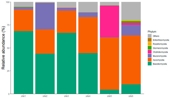 Phylum-level taxonomic composition of fungal communities from the six sampled sites. as determined by metabarcoding analysis. The relative abundance (%) of the fungal phyla is shown for each site. It is noted that Site 1 and Site 2 are located within Partially Serpentinized Peridotites (PSPs); Site 3 and Site 4 within Massive Serpentinites (MSs); and Site 5 and Site 6 within Foliated Serpentinite (FS). Basidiomycota (green band) and Ascomycota (orange band) represent the most abundant phyla across the sites.