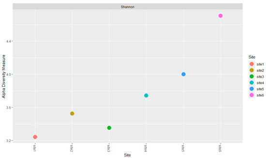 Alpha Diversity (Shannon Index) of the fungal community across the sampling sites. Data were calculated from metabarcoding analysis. The X-axis represents the sites (from 1 to 6), and the Y-axis shows the calculated alpha diversity values.