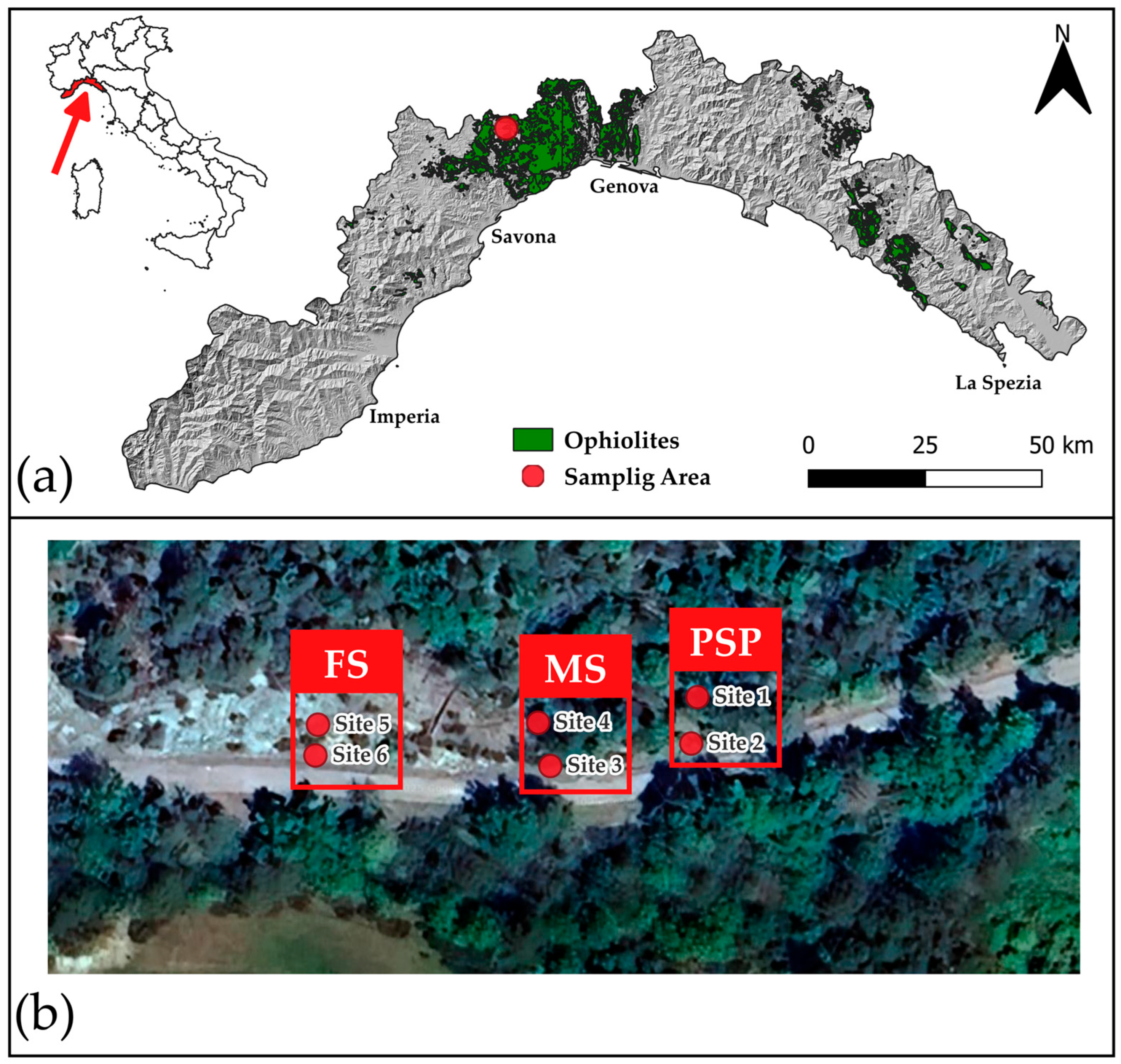 - Marescotti, P.; Comodi, P.; Crispini, L.; Gigli, L.; Zucchini, A.; Fornasaro, S. Potentially Toxic Elements in Ultramafic Soils: A Study from Metamorphic Ophiolites of the Voltri Massif (Western Alps, Italy). Minerals 2019, 9, 502. [Google Scholar] [CrossRef]