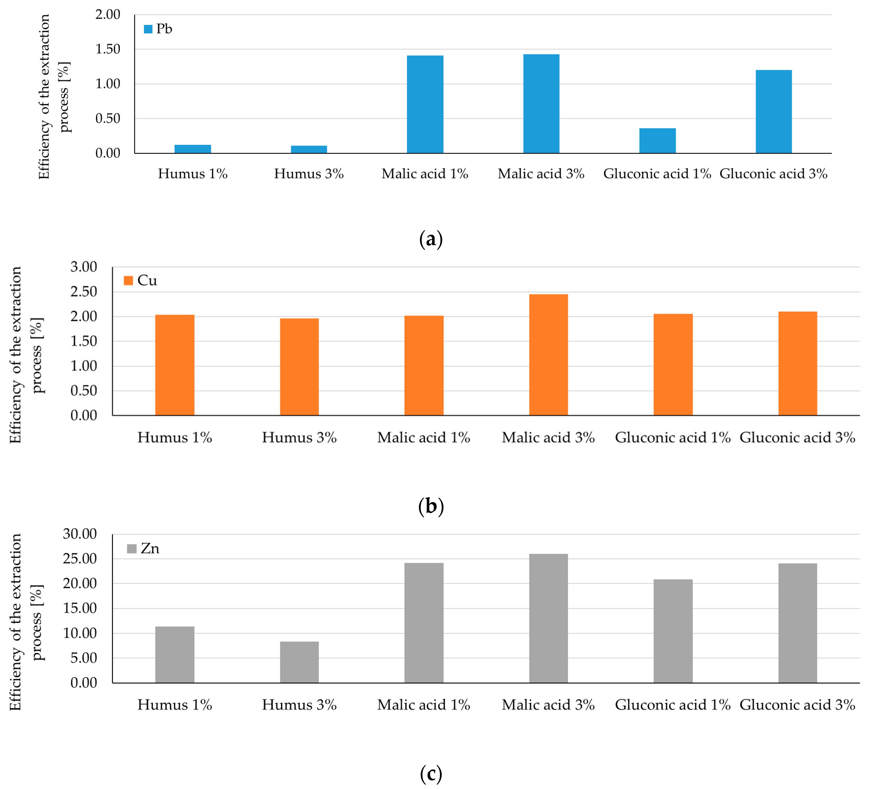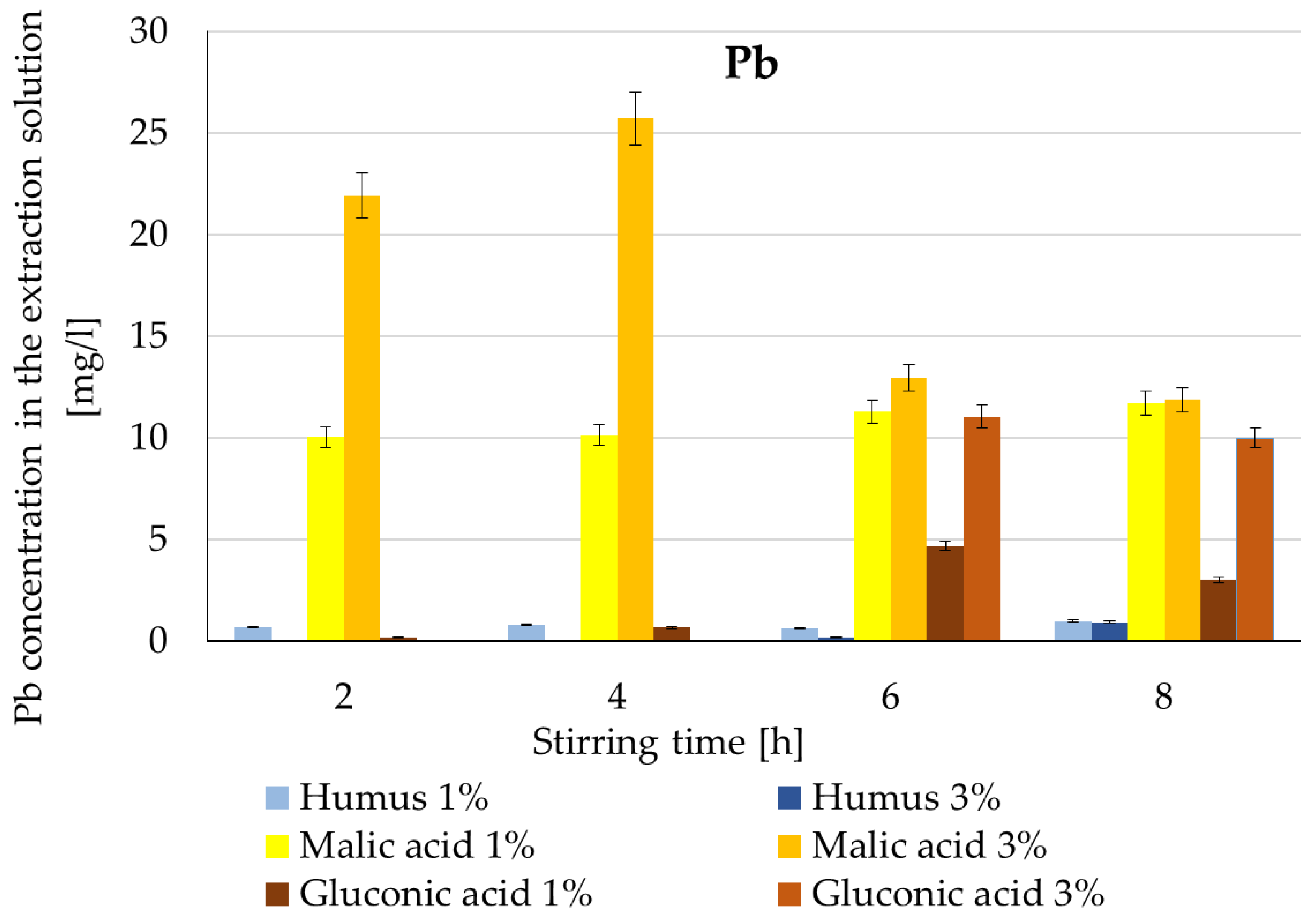 - for Pb extraction, the yield increases over 100 times using humus-based extraction solutions, over 30 times when using 1% malic acid and 1% gluconic acid solutions, and approximately 2.8 and 9 times when using h3% malic acid and 3% gluconic acid solutions, respectively.