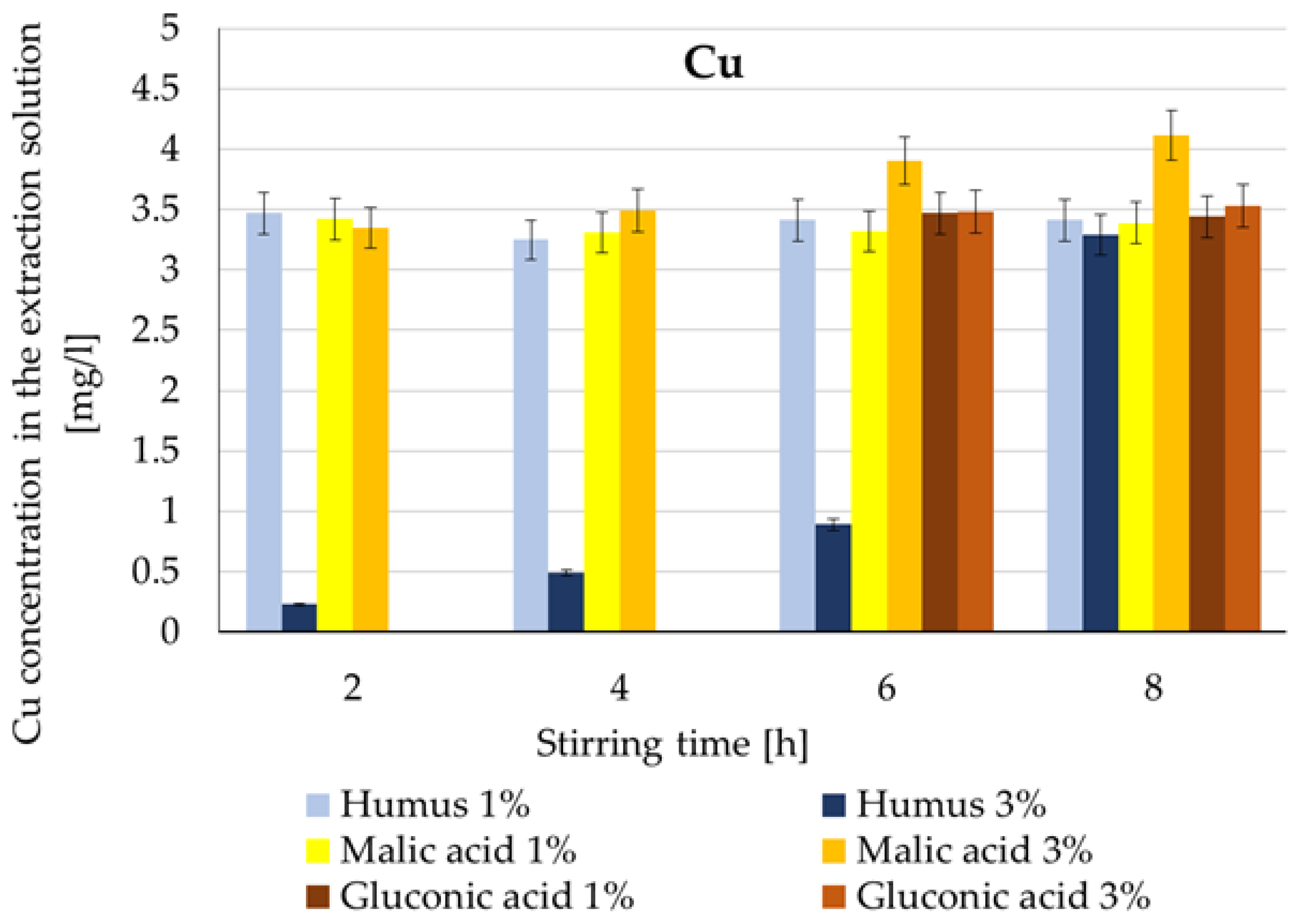 - for Cu extraction, the yield increases 90–100 times using humus-based extraction solutions, and 4 times using a 1% gluconic acid-based extraction solution, but with unsatisfactory results for the other extraction solutions.