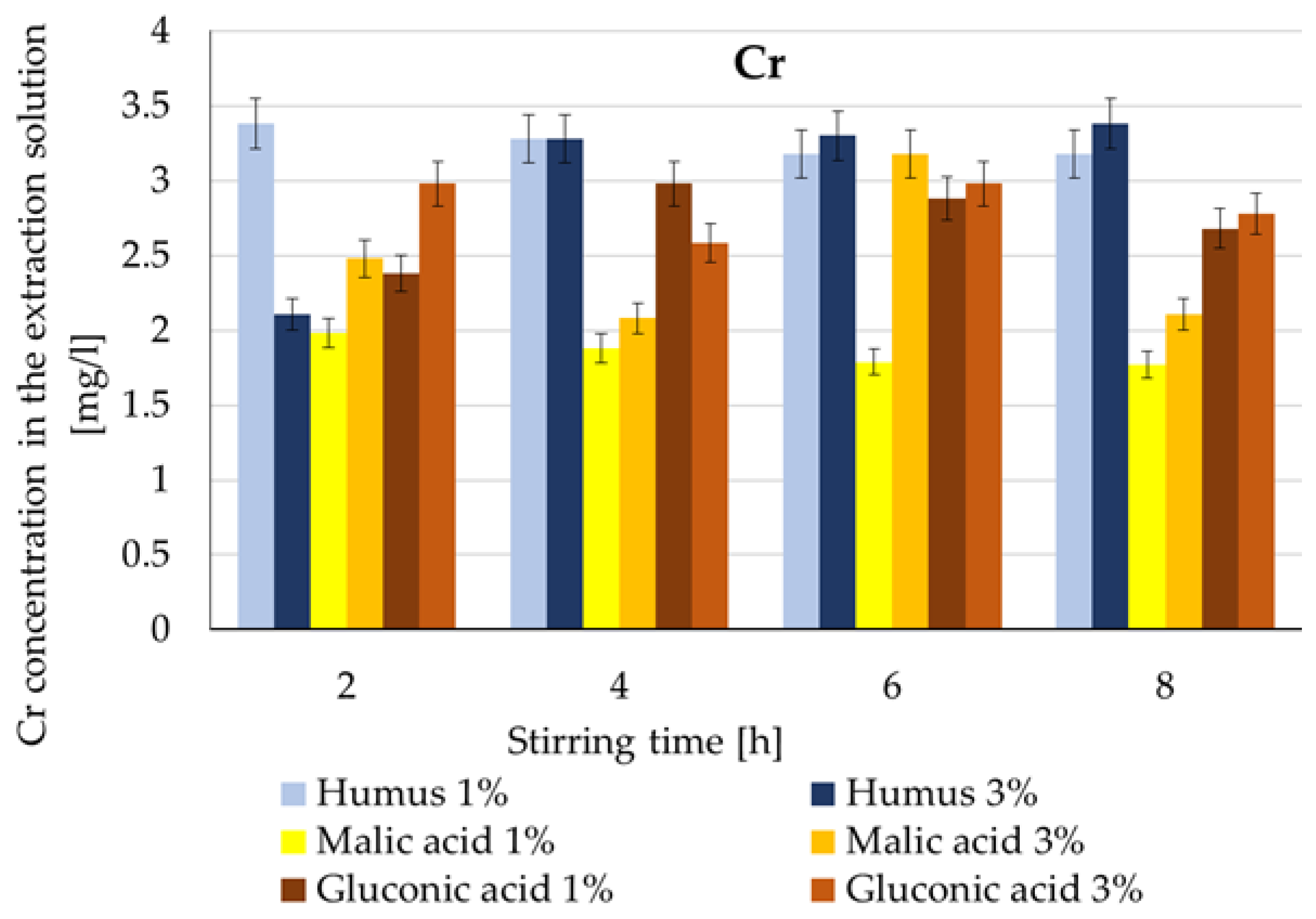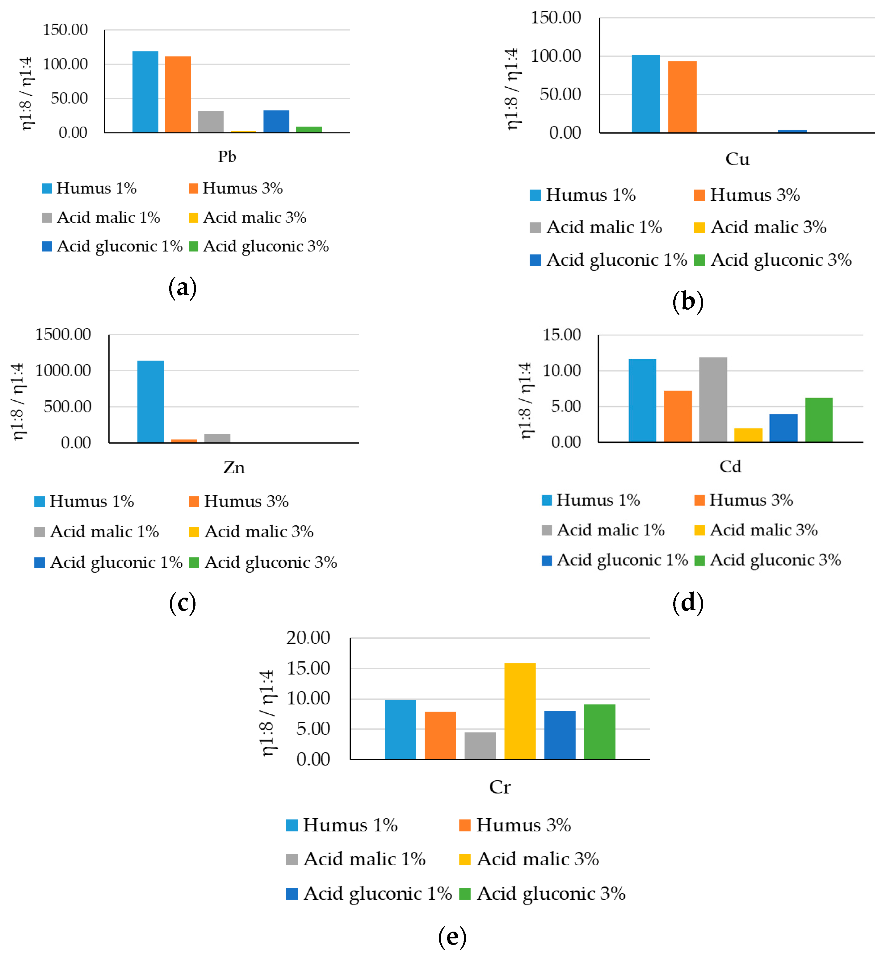 - the extraction yield of Cd and Cr maintains an improving trend more than the increase in costs (>2), within the range of 3.9–15. The yield obtained with a 1:8 ratio was 9 times higher compared to a 1:4 ratio, the only exception being in the case of Cd extraction with a 3% malic acid solution (1.95 times).