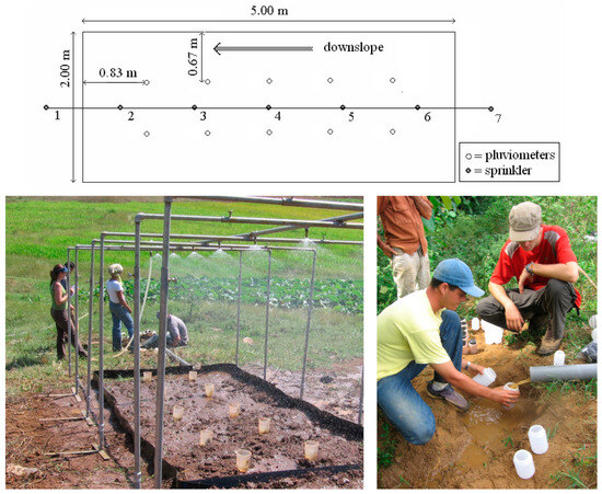 Rainfall simulation experiments were designed to evaluate in situ the hydrological and erosion behaviors of the soils under investigation. Large plots (10 m2) were delimited with rubber plates, partially dug into the soil to prevent water flow into or out of the plots. Plants were carefully removed, ensuring the soil surface remained as undisturbed as possible. Figure 2 illustrates the experimental setup.