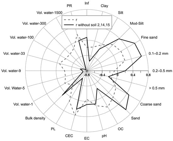 Figure 3 displays the Spearman rank correlation coefficients (r) between soil erodibility and various physical, chemical, and mechanical soil properties, including textural fraction, organic carbon, acidity, electrical conductivity, cation exchange capacity, plastic limit, bulk density, volumetric water retention at different matric potentials, penetration resistance, and infiltration. Rank correlation values are provided for the entire soil domain and also excluding soils 2, 14, and 15.