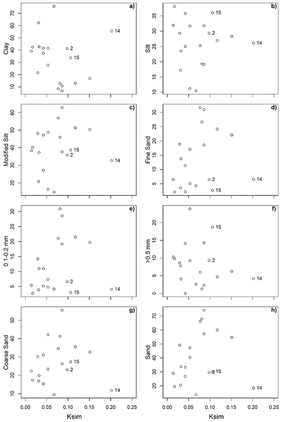 Moving clockwise in Figure 3, and referring to correlations without soils 2, 14, and 15, the ranked correlation coefficient between Ksim and Clay is r = −0.54. Clay content is found to reduce soil erodibility through its cementing structural effects, though the r value and cloud of points in Figure 4a show uncertainty around this relationship. On the other hand, the highest correlation values (from all textural fractions) appeared between erodibility-fine sand and erodibility-(0.1–0.2 mm) fraction, with coefficients of 0.64 and 0.67, respectively. Positive correlations with these soil particle fractions are well-recognized due to their low influence in aggregation, limitation of infiltration by clogging soil matrix pores, and easily transportable particle sizes (e.g., [5,6,39]).